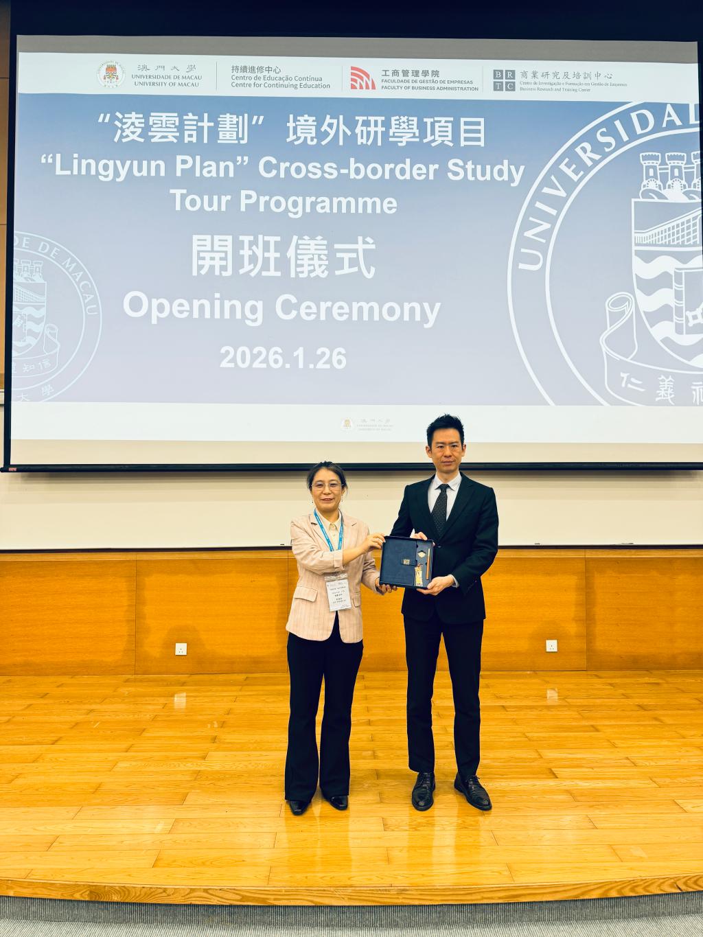 在澳门大学的开班仪式上,澳门大学持续进修中心刘丁己教授代表校方对研学团的到来表示热烈欢迎,详细介绍了澳门大学的办学特色与澳门当地文化。山东科技大学随队教师刘伟娟老师与刘丁己教授互相赠送了具有校地特色的礼物。