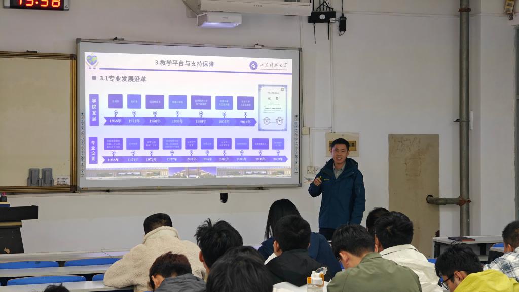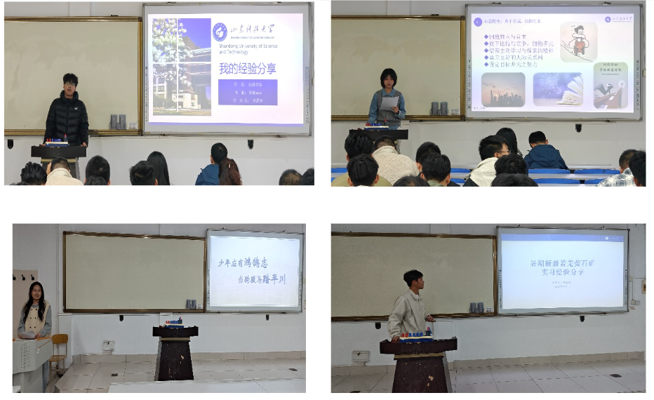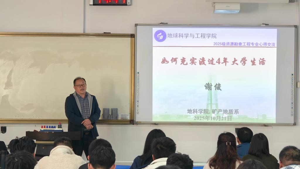 随后,2022级班长刘清坤、2023级团支书陈思予婷、2024级团支书马雨菡分别从学业规划、课外实践、社团活动、时间管理等角度,分享了各自的大学生活体验与成长心得。2023级钟敦河结合暑期新疆野外实习经历,以图文并茂的方式讲述了野外工作的收获与感悟,生动展现了资源勘查专业的实践魅力。