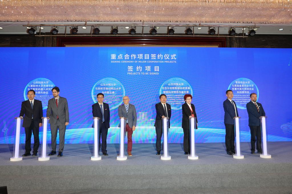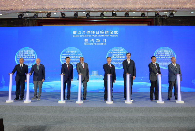 开幕式上,涵盖高端装备、现代海洋、智慧农业、AI+动物疫苗等前沿领域的8项国际合作协议顺利签署。山东科技大学、山东省滨州畜牧兽医研究院、山东省科学院自动化研究所等高校及科研院所与伊朗伊斯法罕理工大学、俄罗斯圣彼得堡国立海洋技术大学、加拿大健康科学院、埃及国家研究中心农业与生物研究所、西班牙格拉纳达大学、吉尔吉斯斯坦总统直属国家科学院、德国康斯特大学海洋实验室、英国皇家农业大学先后签署人才培养、科技合作协议。