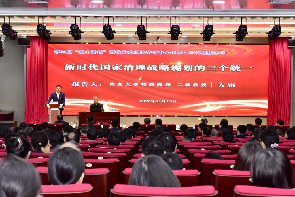 11月13日,山东科技大学第53期“泰山讲坛”开讲,山东大学特聘教授、二级教授方雷应邀作题为《新时代国家治理战略规划的三个统一》的专题学术报告。校党委书记王君松主持报告会,校党委理论学习中心组成员和处级以上干部,机关科级干部、专职组织员、思政课教师、学生工作干部等千余人同赴一场“思想盛宴”。