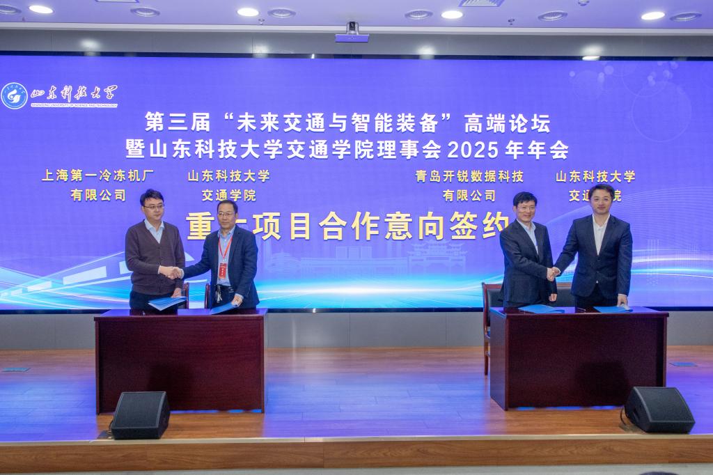 交通学院党委书记岳国伟宣读理事会新增单位名单。诸葛福民为副理事长单位代表颁发聘书。学校合作发展处处长王晓东、教务处副处长李朋为新增理事单位代表颁发聘书。学校研究生学院副院长张明光、科技处副处长赵健代表学校接受单位代表青岛洋逸海洋科技有限公司、山东永恒电子科技有限公司捐赠。交通学院院长辛嵩与上海第一冷冻机厂有限公司副总经理鲁俊、交通学院王可教授与青岛开锐数据科技有限公司总经理赵杰分别签约重大项目合作意向书。