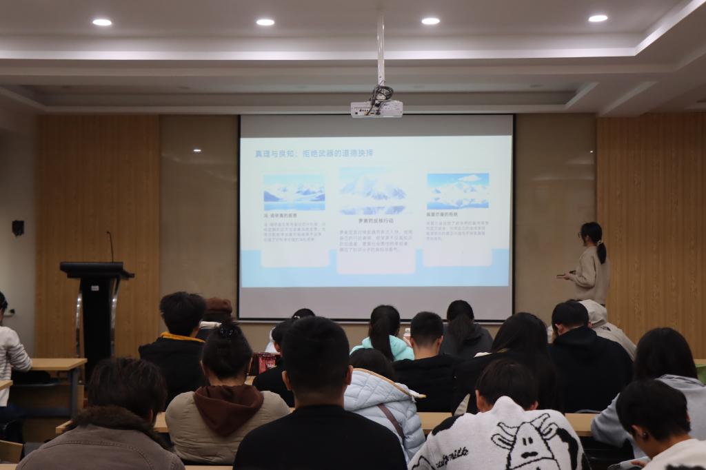 各团支部学生代表依次登台,通过讲述数学家追求真理、献身科学的故事,深情回望我国数学事业的发展历程。他们从华罗庚的家国情怀谈到陈省身的学术坚守,从苏步青的躬耕不辍讲到吴方的潜心钻研。一位位数学大师以卓越成就和高尚品格,为新时代青年树立起追求科学、勇攀高峰的精神坐标。同学们认真聆听,在感悟中汲取力量,在交流中凝聚共识。(通讯员:王文轩 梁天雨 摄影:闫文兵 王颢达 刘昊阳 实习编辑:秦宇泰)