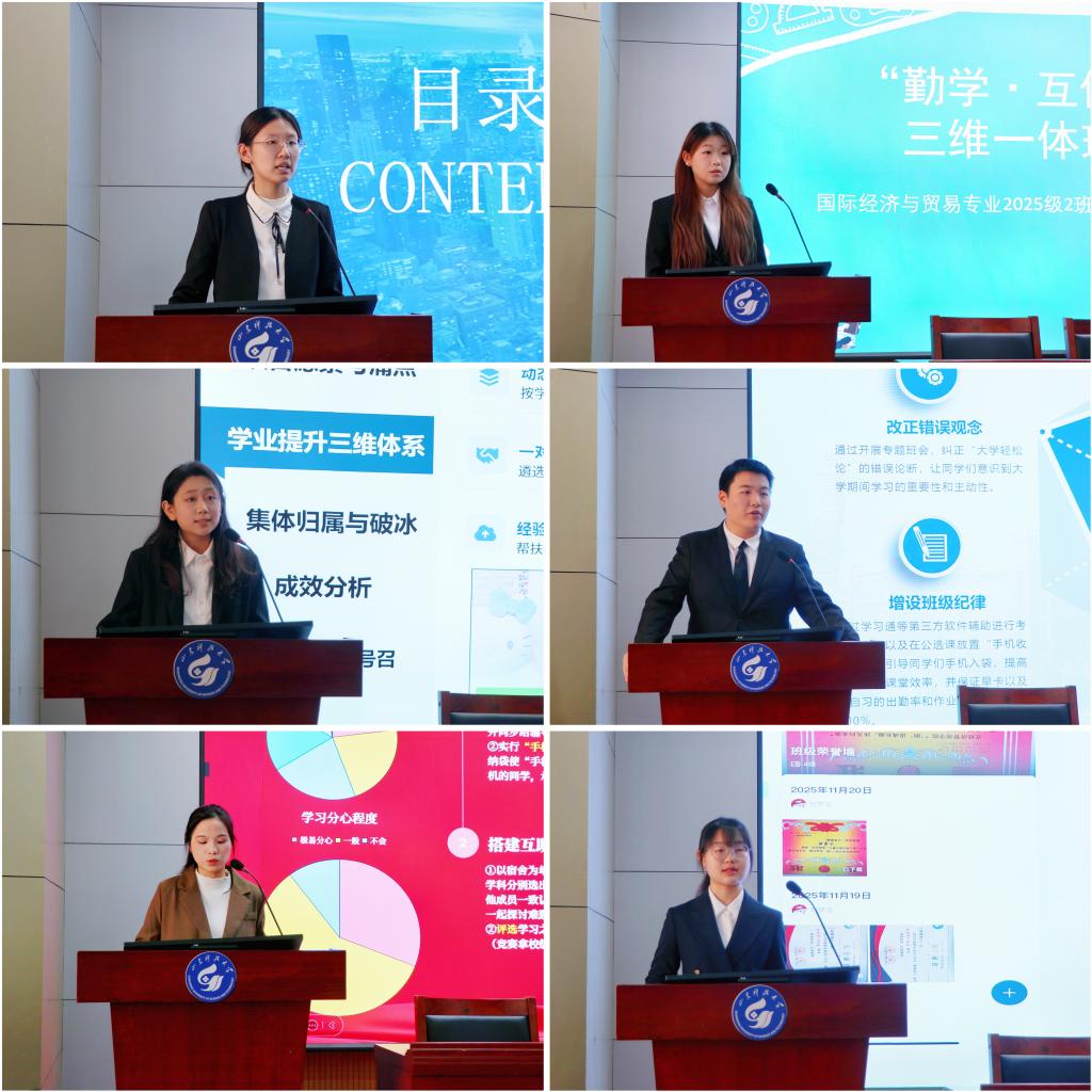 2024级、2025级班级负责人结合班级实际情况,从“学风建设立项背景”“班级学风问题分析”等方面进行汇报,分享了通过制定班级公约、组建学霸帮帮团和约束机制等多种形式提升班级同学学业水平和英语四六级通过率等。