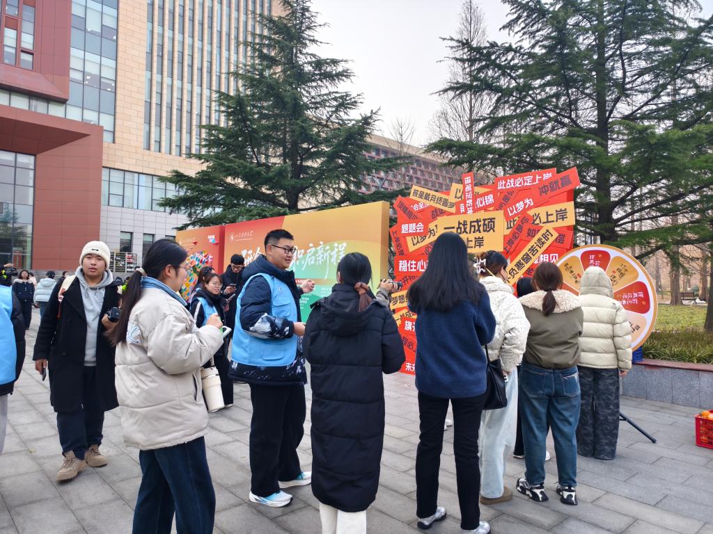 活动现场,同学们纷纷在“一战成硕”打卡点拍照打卡,并通过制作纸飞机、写祝福语等方式,留下暖心祝福与美好期望。“能量大转盘”互动游戏区,同学们积极参与,并获得橙子、饺子、向日葵钥匙扣等寓意美好的礼物。