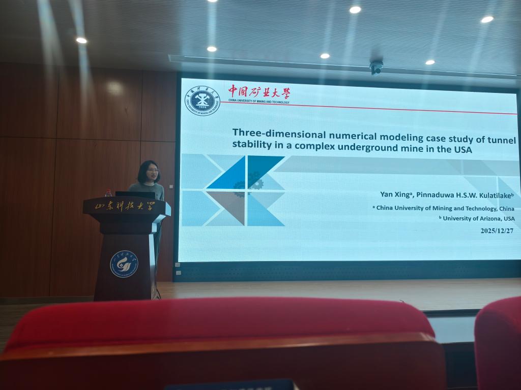 YanXing博士作了题为《美国一座复杂地下矿井中隧道稳定性的三维数值模拟案例研究》的报告。她系统阐述了从矿场概况、隧道几何结构到数值模型构建与应力分析的完整研究路径,分享了复杂地质条件下隧道稳定性评估的先进模拟方法与宝贵工程经验,为师生呈现了严谨的工程研究范式。(通讯员:姚一鸣 江晟 实习编辑:姜雪)