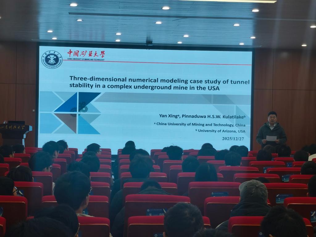 近日,土建学院在J15-136报告厅举办学术交流会,本次交流会特邀国际著名采矿岩石力学专家、美国亚利桑那大学岩体模拟与计算力学实验室主任Pinnaduwa H.S.W. Kulatilake教授及YanXing博士,围绕“矿井工程与煤体力学前沿研究”展开交流与研讨。会议由土建学院副院长杨旭旭主持。