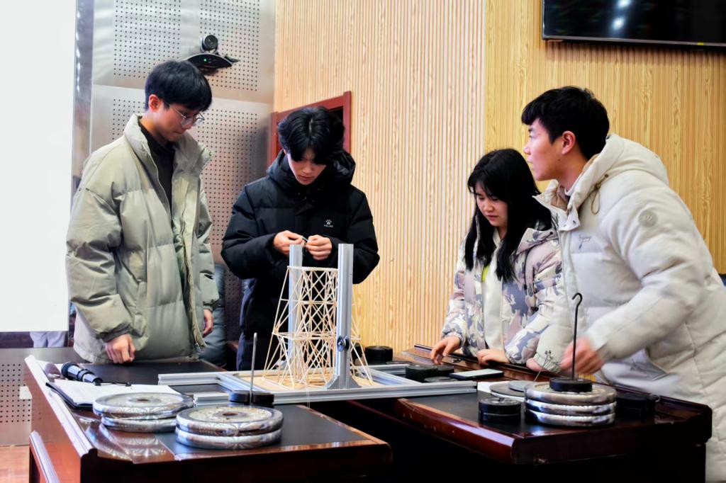 比赛共吸引土建学院8支队伍参加。作品涵盖经典桁架创新与智能建造构想等方向。赛程包括方案汇报、答辩展示与加载测试三个环节。在加载测试中,各模型接受专业承重检测,通过荷载数据与变形情况直观验证结构性能。经过评比,“逐梦匠星队”凭借优化的空间桁架与交叉斜撑结构获一等奖,“魔力无限队”获二等奖,“痴心绝队”“建模实践小组”“星际航队”获三等奖。(通讯员:李沛东 韦元顺 摄影:郑金铭 实习编辑:王文博)