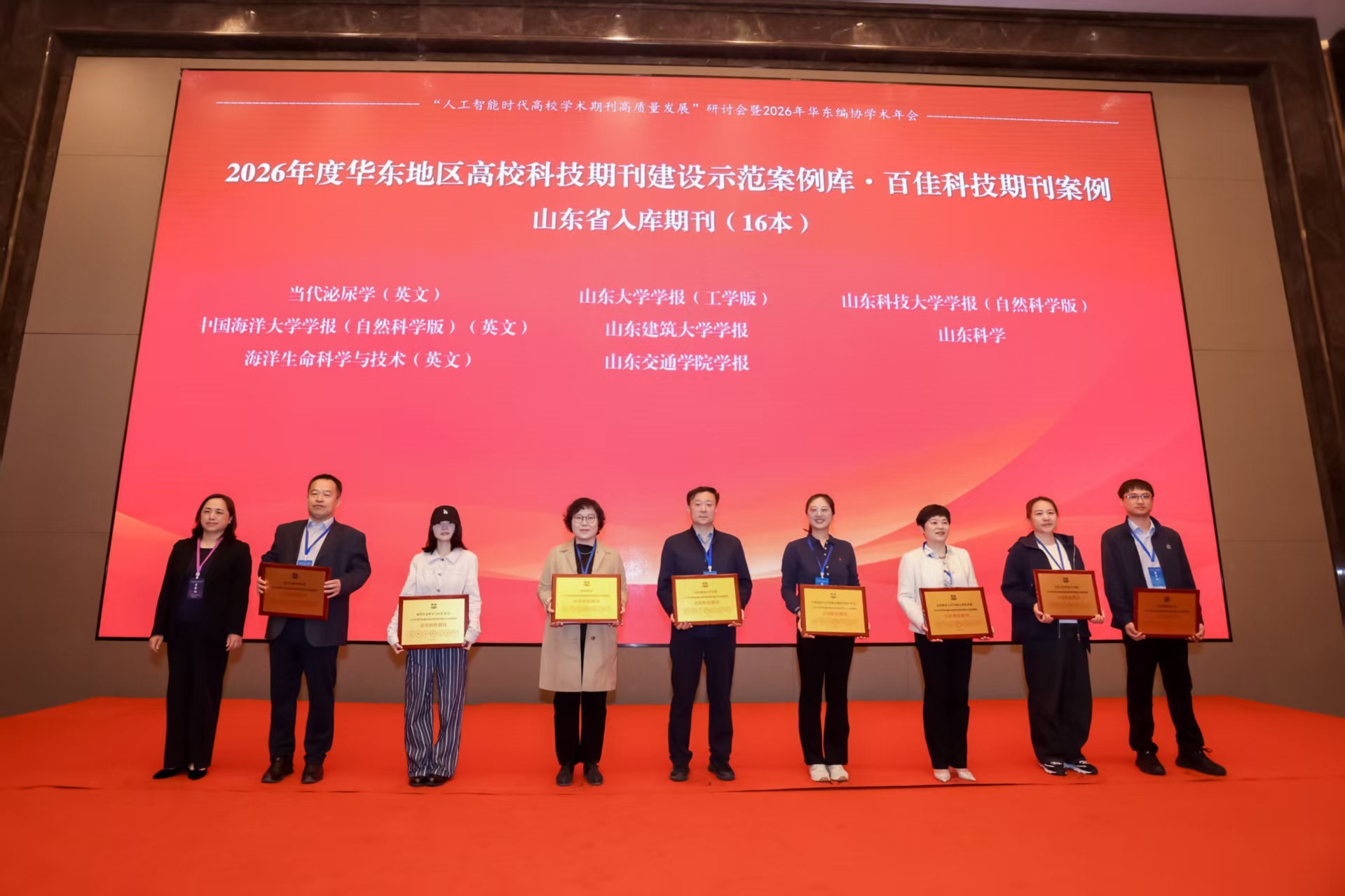 近日,“人工智能时代高校学术期刊高质量发展”研讨会暨2026年华东编协学术年会在江西上饶召开。会上发布了“2026年度华东地区高校科技期刊建设示范案例库”遴选结果,《山东科技大学学报(自然科学版)》获评“百佳科技期刊”。