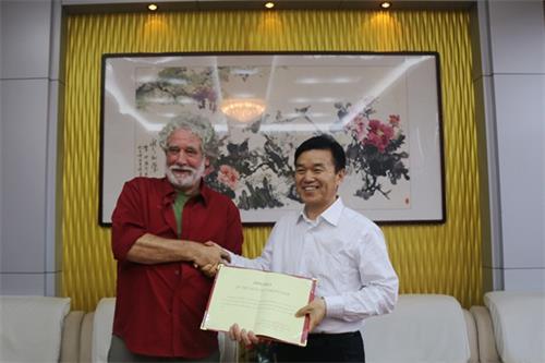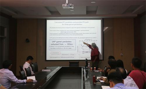 会上,Herman详细讲解了世界上典型超高压带“挪威西片麻岩区”内的石榴石橄榄岩的地质背景、矿物岩石学、年代学以及地区化学的研究等情况,并特别介绍了在石榴橄榄岩中发现的两类超硅石榴石。与会师生纷纷向Herman教授提出自己的疑问,现场气氛十分热烈。会后,韩作振在接待室为Herman van Roermund教授颁发聘任书,正式聘任Herman van Roermund为地科学院兼职教授。