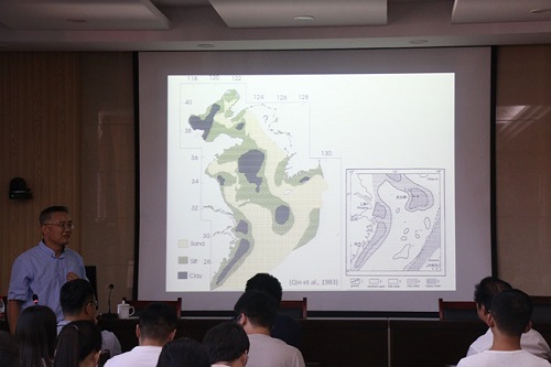 刘敬圃以《亚洲河口海岸三角洲研究近况及最新进展》为题,系统介绍了他在亚洲主要河口三角洲地区开展的调查研究,探讨了自然因素和人类活动对河口海岸变迁的影响,并结合当前海洋地学研究热点,对地科学院海洋地学科研发展方向提出了建设性的意见。大家踊跃发言,对不同河口三角洲的沉积特征差异、主要控制因素等科学问题进行了深入交流和探讨。
