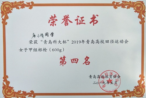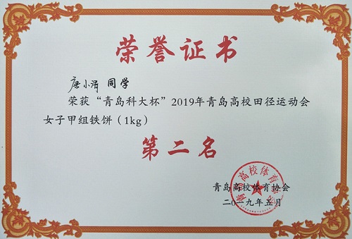 5月22日至24日,由中共青岛市委教育工委、青岛市教育局、青岛高校体育协会主办的“青岛科大杯”2019年青岛高校田径运动会在青岛科技大学举行。本届为期三天的青岛高校田径运动会共吸引了来自中国海洋大学、青岛大学、青岛理工大学等23所驻青高校的485名学生参加36个项目的竞技比赛。数学学院2016级统计学专业唐小清荣获女子甲组铁饼(1kg)比赛第二名、女子甲组标枪(600g)比赛第四名。(数学学院供稿 实习编辑:康恺瑞)