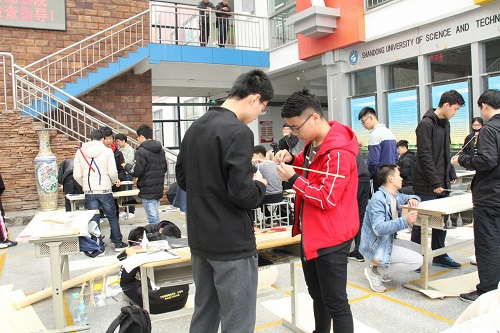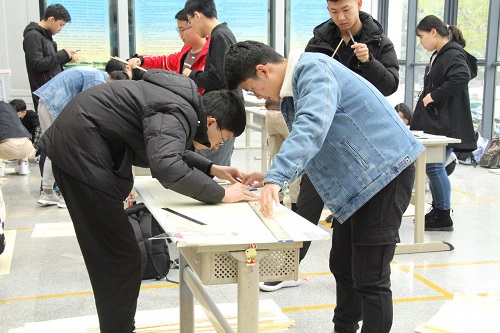 在比赛开始前几周,参赛选手们就已经着手准备,设计结构,计算承重,考虑作品重量。4月13日上午8时,参赛同学按时到达土建楼大厅,领取比赛材料,并在规定场地开始制作自己的模型。参赛选手通过合作计算、设计、动手,努力在比赛中发挥出最佳水平。经过的16个小时的模型制作,截止14日下午5时,共33支队伍顺利完成模型制作,3支队伍因未能完成而退赛。模型制作结束后,比赛进入模型称重环节,工作人员为33个模型依次称重。