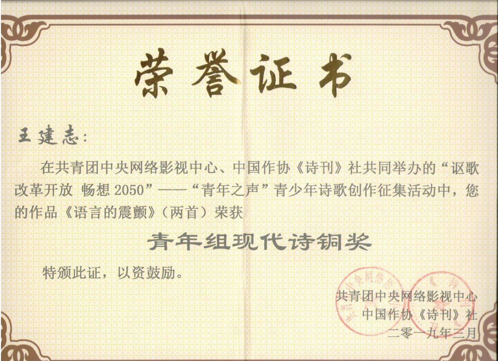 近日,马克思主义学院教师王建志的诗歌作品《语言的震颤》获团中央网络影视中心与诗刊社联合主办的“讴歌改革开放 畅想2050——‘青年之声’青少年诗歌创作征集”铜奖。