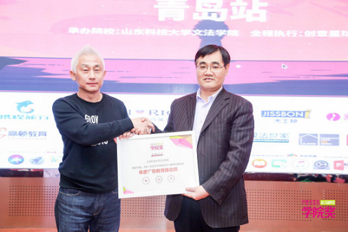 孙法柏对文法学院与中国大学生广告艺术节学院奖多年来的合作关系以及广告学系取得的优异成绩进行介绍,高度赞扬了学院奖为广告专业教育、创新创意人才培养的推动作用,希望学生们借助平台积极参与全国性的创意竞争,用创意与灵感有力推动广告事业的发展。李建强代表组委会向文法学院颁发“年度广告教育推动奖”。徐玲平代表文法学院接受京东创意实践基地的授牌。