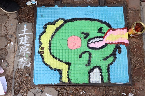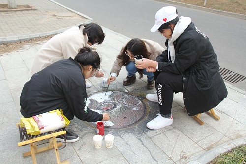 志愿者们按照分组用水桶和扫把对所选井盖进行清理,确保颜料可以清晰上色。随后,志愿者们用粉笔把图案底稿画在井盖上,然后在调配颜料。上色过程中,因为使用的是丙烯颜料,上色困难,需要保持耐心一层一层的反复涂颜料。最后,待颜料干后涂上一层防水油漆,以保证画好的井盖可以长时间保留。各组分工明确,心思精巧,一个个井盖被画成奶牛、星空等青春新潮之作,引起路过同学驻足欣赏。(通讯员:尚军 资麟鹏 实习编辑:毕泗兴)