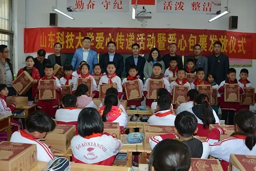 近日,山东科技大学爱心传递活动暨爱心包裹发放仪式在郯城鲁能希望小学举行,郯城县教育局和共青团相关领导、学校派驻归昌乡郯城县帮扶第一书记、郯城鲁能希望小学校长及50多名学生代表参加活动。