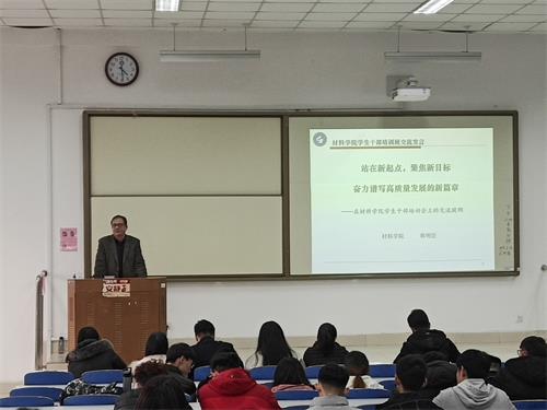 韩明臣以“站在新起点,聚焦新目标,奋力谱写高质量发展新篇章”为题,对2018年度学院学团工作进行点评,对新形势下学团工作存在的问题进行分析,并对2019年学院学团工作进行部署。他指出,站在新起点,我们应该增强材料自信;面对新要求,我们仍然面临严峻考验;聚焦新目标,我们仍然需要奋力拼搏。他要求全体学生干部坚持“不忘初心,牢记使命,以学生为中心,以高质量发展为目标,以国家和人民需求为导向,以走在前列为主线,打基础,抓重点,补短板,创品牌,强保障”的工作思路,加强常规管理和制度执行,加强理论引导、学风建设、创新实践、文化建设、就业创业工作,开展品牌项目研究实践,补齐工作短板,全面推动工作升级。(通讯员:李白羽 杨少瑞 实习编辑:张紫雯)