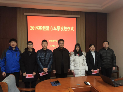 1月11日,外国语学院举行2019年寒假爱心车票发放活动暨毕业生就业工作座谈会。外国语学院党委书记李双立、党委副书记马海超、团委书记杜中华参加了此次活动,把学院的温暖送到毕业生手中。