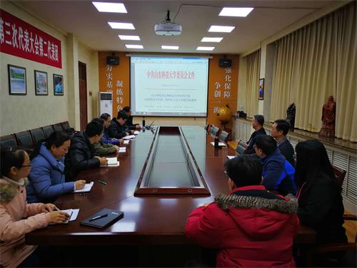 李垂文传达介绍了本次党代会有关情况,带领与会人员学习了校党委书记罗公利在学校第三次党代会上的报告。讨论发言中大家认为,报告全面客观总结了近十几年来学校改革发展取得的巨大成就和宝贵经验,令人鼓舞;报告生动描绘出学校未来发展的美好愿景并清晰规划出实现路径,催人奋进。与会人员表示将以报告精神为统领,凝心聚力,开拓进取,共创学校美好未来。