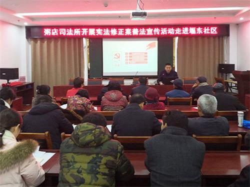 庄严宣誓后,粥店街道堰东社区负责人简要介绍了此次活动的目的和意义,粥店司法所刘波向党员和青年法学会同学进行有关宪法修正案的主题宣讲。