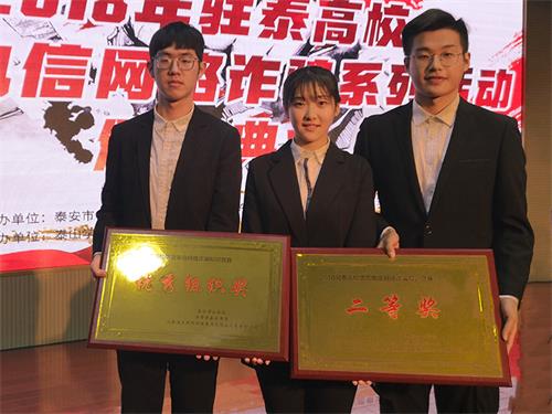 12月11日,2018年驻泰高校防范电信网络诈骗知识竞赛于泰山学院成功举办。我校泰安校区代表队获得2018年驻泰高校防范电信网络诈骗知识竞赛二等奖。