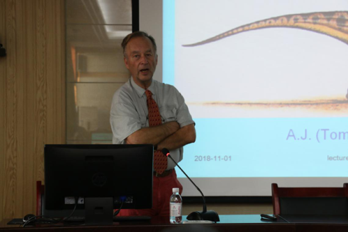 韩作振向大家简要介绍了Van loon教授,并对他的到来表示热烈的欢迎和衷心的感谢。 Van loon先介绍了国外学者莫里森对蜥脚类恐龙生存密度做出的一系列计算并得出了蜥脚类恐龙对中生代的气候变暖有贡献的结论,并提出了一定的质疑,他用恐龙迁徙、捕食者猎杀、疾病、瘟疫、寄生虫以及食物短缺等一系列依据来证明了自己的质疑,并认为蜥脚类恐龙对中生代的气候变暖有贡献这一结论是站不住脚的。接下来他又对冰河时代理论从无到有再到进一步发展做出了介绍,并鼓励同学们要思维灵活,敢于接受新思想。(地科学院供稿 实习编辑:毕泗兴)