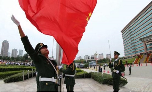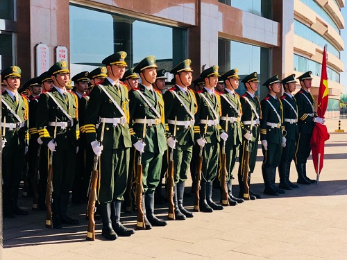 ,国旗护卫队铿锵有力的步伐响彻黄岛区区政府广场