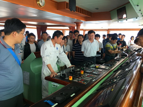 向阳红01号船长俞启军为大家进行了讲解,对向阳红01号有关情况进行了介绍,带领师生们参观了科考工作区、指挥操作区、生活区、休闲区及直升机起降平台,并讲述了首次环球海洋综合科考的故事。