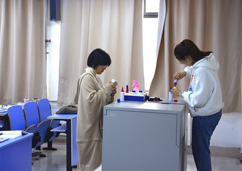 在明确分工后,志愿者们进入教室,投身于忙碌却充实的工作中。他们轻声进入教室,小心翼翼地将墨水倾倒在笔囊中,脸上认真且严谨的表情完美诠释了他们对“奉献”一词的感悟,每一间教室都留下了志愿者们默默付出的身影。