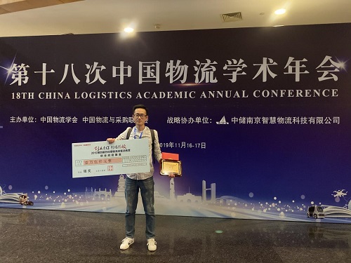 11月15至17日,第十八次中国物流学术年会在南京顺利举行。此前,交通学院学生作品在由中国物流学会、青岛日日顺物流有限公司共同主办的2019第四届“日日顺物流创客训练营” 比赛中荣获银奖,中国物流与采购联合会副会长、中国物流学会执行副会长贺登才出席学术会议并为交通学院学生颁奖。