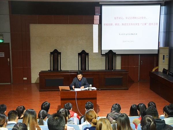 10月29日,泰安校区文法系在模拟法庭举办“始于初心,牢记立德树人之使命,积极创新、研究、推进文法系大学生‘三课’提升工程”专题党课。文法系党总支副书记兼副主任刘相明担任主讲人,全体学生党员参加。