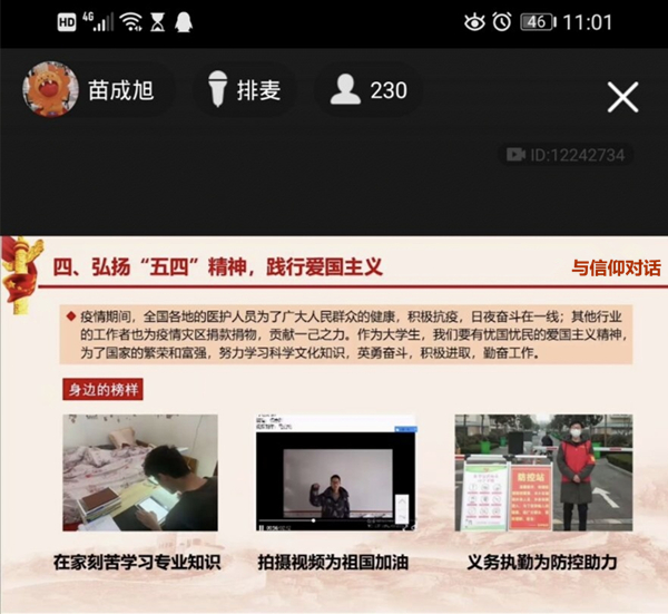 5月5日,机电学院领航青春宣讲团通过QQ群课堂网络平台开展五四精神系列宣讲活动,首场由能源与动力工程2016级学生苗成旭主讲。