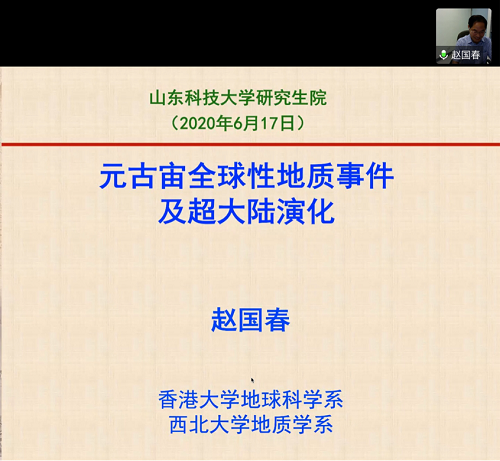 6月17日晚7点,由研究生院主办、地科学院承办的2020年“名家讲坛”通过线上平台举行。本次“名家讲坛”的主讲嘉宾是赵国春院士,报告题目为“元古宙全球性地质事件及超大陆演化”。报告会由研究生院院长韩作振主持,部分教师和研究生参加了讲坛活动。
