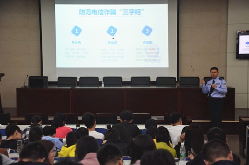 纪国华介绍了电信诈骗的概念以及网络刷单、冒充网购平台客服、二维码诈骗等八大电信诈骗手段,并逐个讲解了应对之术。他强调,以电话、微信、QQ、短信、邮件、钓鱼网站作为六大常用工具的电信诈骗时时刻刻发生在我们的身边,高校学生因个人信息泄露,社会经验不足,尤其成为犯罪分子的作案目标,大家不能掉以轻心。纪国华结合真实案例,提醒学生们要加强警惕,注意时刻防范。