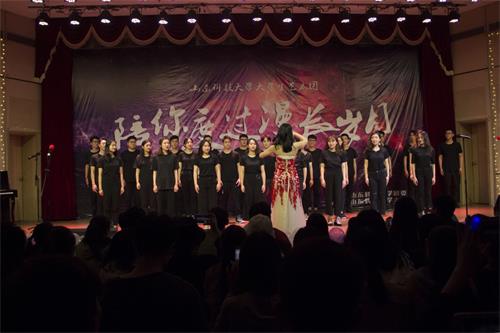 本次演出歌曲风格多样,涵盖了民族说唱、摇滚、流行、民谣、合唱等多种形式。伴随着《Lady Marmalade》动感的旋律,演出在舞者热情洋溢的舞姿中华丽开场;女声二重唱《老街》在原歌曲的基础上加入和声,给听众们带来全新的体验;偶像男子天团带来的《小半》,以清新的风格展现在观众面前;《It’s my life》瞬间点燃现场观众的热情,将现场气氛推向高潮;《沧海一声笑》以说唱形式令人耳目一新;红高粱的主题曲《九儿》,生动地将一个坚强不屈的人物形象呈现在观众面前,引得现场呐喊声此起彼伏;合唱歌曲《我爱你中国》,表达出学生们对祖国深深的热爱与赞美;歌曲独唱《如果你也听说》,引来观众阵阵掌声。最后,在一首动情歌曲《后来》中,演出落下了帷幕。