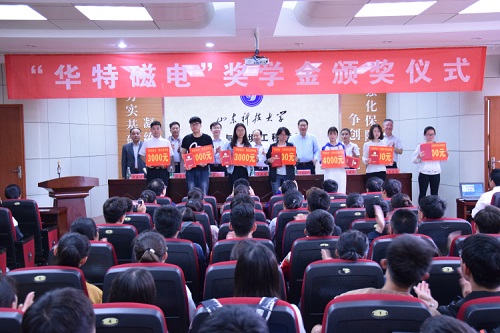 会上,化工学院党委书记李垂文宣读表彰决定,张晚佳等14名同学获得了“华特磁电”奖学金。化工学院院长吕宪俊向山东华特磁电科技股份有限公司长期以来对学院的支持及帮助表示感谢,对公司领导支持教育、回馈的社会的善举表示崇高敬意。他希望大家志存高远,不断超越自我,常怀感恩之心,用优异的成绩回馈社会。矿物加工工程2014级张文进代表获奖学生上台发言。山东华特磁电科技股份有限公司董事长王兆连对获奖学生表示祝贺,他说企业的发展离不开山东科技大学领导、相关学科老师的支持和帮助,感谢学校向企业输送了一大批高质量人才。他介绍了公司发展历程及取得的系列成果,表示企业会继续承担起社会责任,在新旧动能转换中发挥排头兵作用。他诚挚邀请与会领导、师生到公司参观交流,近距离地了解公司。