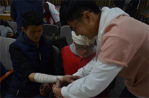 宣讲会上,宣讲人员首先为同学们讲解了创伤的分类和处理方法。红十字服务中心工作人员在现场为同学们演示了头部、肩部、胸部的包扎的手法,并指导现场学生模拟练习。随后,宣讲人员给同学们播放了一段海姆立克急救法的教学视频,并由红十字工作人员给大家演示了海式手法等梗塞救治方法和心脏复苏方法。演示完毕后,宣讲人随机邀请了一位同学在工作人员的指导下实际演练了一次心脏复苏的具体操作。最后,宣讲人员给大家讲解了结核病的预防、症状、治疗误区与正确治疗方面的知识,来帮助大家预防结核病。(通讯员:张世昊 胡家浩 实习编辑:公萍)