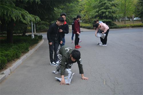 比赛分为遵义会议、巧渡金沙江、飞夺卢沟桥和胜利会师四部分,并在每个活动点上设立有关长征问题的试卷,通过综合游戏所用时间和答题正确率来决定队伍名次。首先,所有参赛队员在泰山广场集合,三人背对背夹气球前往目标点进行答题完成“遵义会议”;紧接着通过三人四足的方式前往第二个答题点体验“巧渡金沙江”;随后进行“飞夺泸定桥”,参赛队员用报纸来代替长征中的木板,三人相互配合踩着报纸走到终点,最终在“会宁”将三个沙包投进目标点完成“胜利会师”。在活动过程中同学们不仅需要团队协作,还要考验策略,最重要的是要有锲而不舍的长征精神。