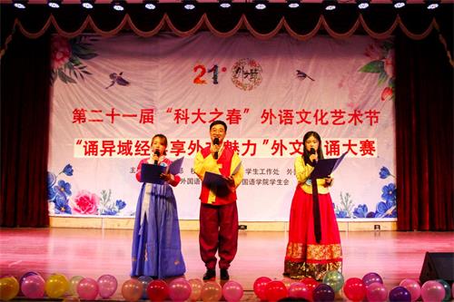 近日,由党委宣传部、校团委、教务处、学生工作处和外国语学院共同主办,外国语学院团委和学生会承办的“诵异域经典·享外文魅力”外文朗诵比赛于大学生活动中心二楼报告厅举行。
