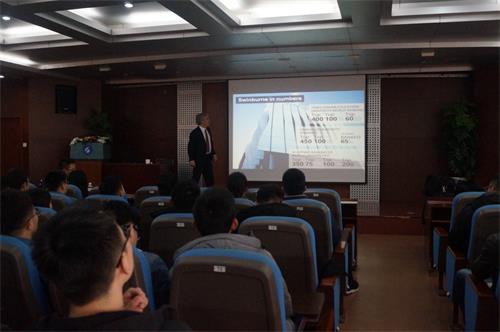 Geoffry Brooks首先介绍了斯威本科技大学的发展历史和优势学科,以及在虚拟仿真方面所取得的成果及未来工厂项目建设、规划情况,接着对博士生招生的有关政策进行了讲解。他还传达了学生在成功申请斯威本科技大学博士生后,有机会获得全额奖学金,以帮助博士生更好完成学业这一新政策。最后,Geoffry Brooks教授表示希望斯威本科技大学与机电学院在学生联合培养方面有更多的交流与合作。(机电学院供稿 实习编辑:王爱辉)