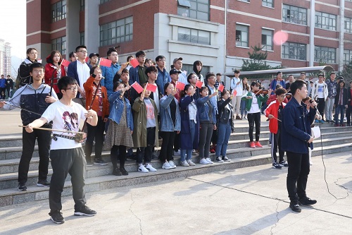 在十九大后的首次全国两会闭幕后第一周,落实两会精神成为我校团委工作重点,为传播积极向上的正能量,校团委组织了此次红歌快闪活动,表演者