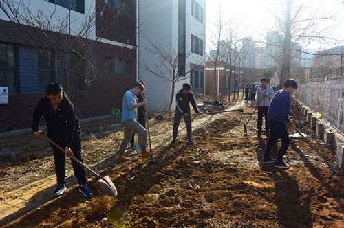 活动中,学生们把地上的杂草、树根和枝杈清理干净,为土地松土,以便幼儿园的孩子们进行绿植活动。大家相互配合,十分默契。经过学生们三个小时的辛勤劳动,一片原本杂草丛生的荒地焕然一新。