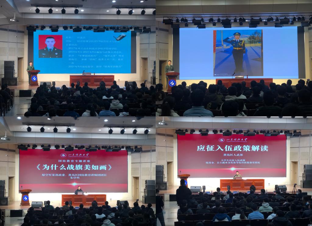12月14日,学校召开2022年上半年征兵宣传动员大会。黄岛区委常委、人民武装部政委闫明智,原空军某部政委、黄岛区国防教育讲师团团长朱序科,黄岛区人民武装部政工科科长刘书麟,军事科参谋徐敬光参加大会。学校学工部、武装部、各学院学生工作负责人、征兵工作负责辅导员、退役复学学生代表和有应征入伍意向的大学生代表约200人参加活动。会议由学生工作部、武装部副部长孔环主持。