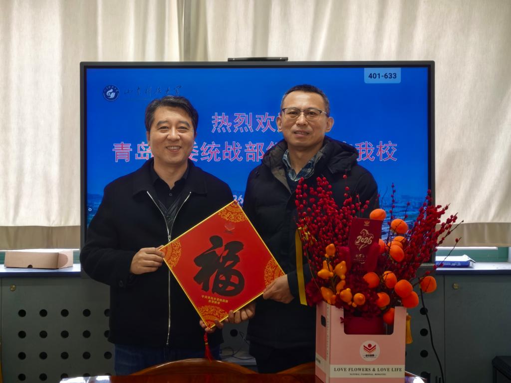 1月30日上午,青岛市委统战部五处处长张斌一行来到我校,亲切走访慰问我校无党派人士、黄岛区政协常委、市党外知识分子联谊会副会长、校知联会会长、安全与环境工程学院副院长曹晓强教授并座谈交流。学校党委统战部副部长于娜陪同参加活动。