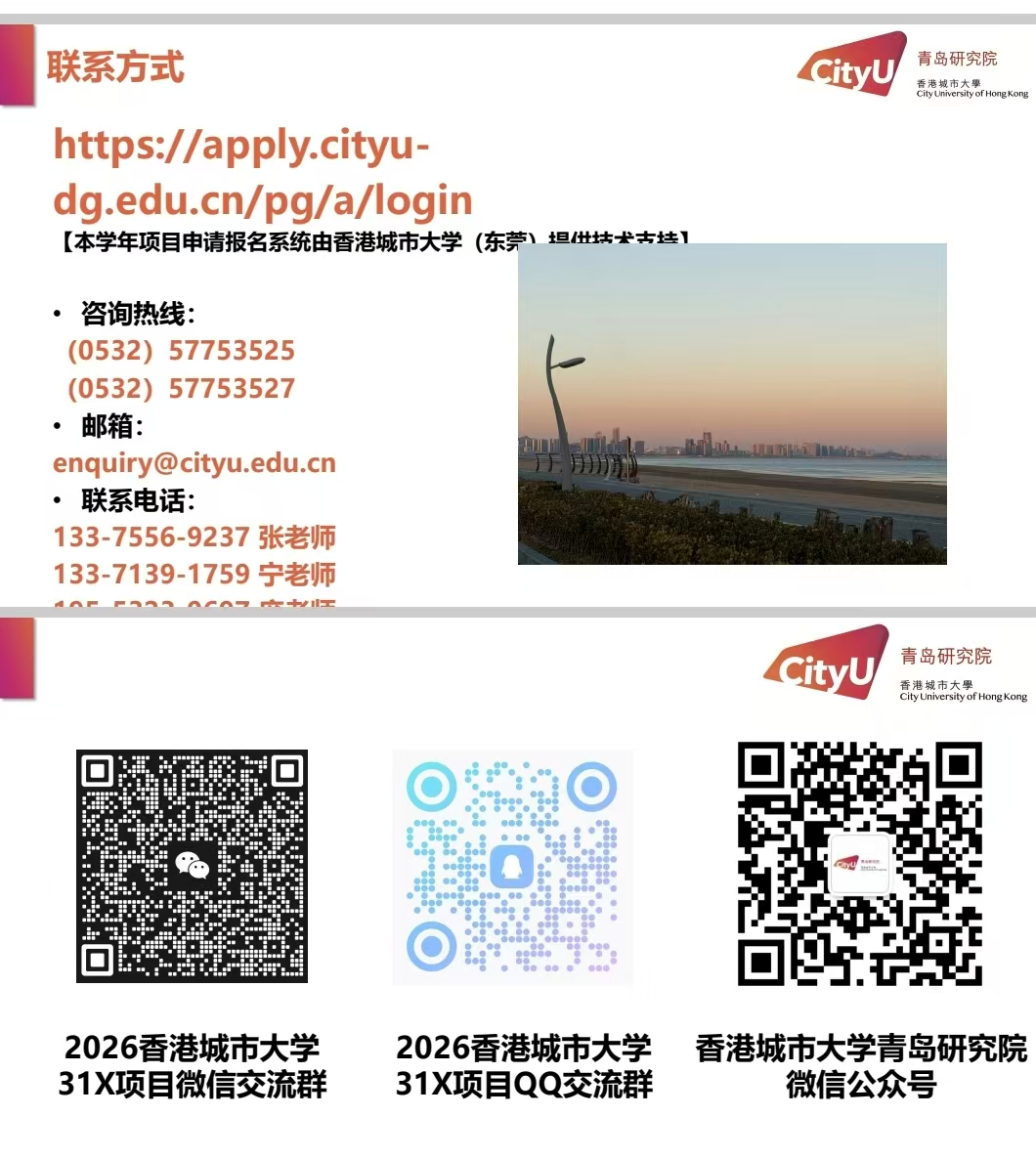 2.香港城市大学青岛研究院进行材料审核并进行滚动面试。具体面试时间以及面试安排将根据实际情况通过邮件及电话通知到学生本人,请申请人保证通讯畅通。