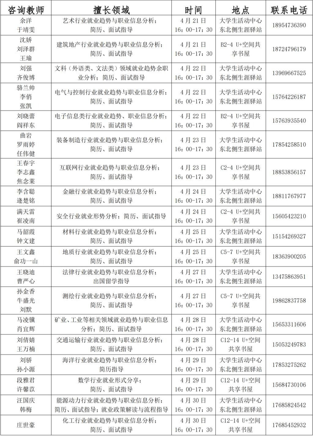 为帮助学生进一步做好职业规划,提高求职就业竞争力,“春季促就业攻坚行动”暨就业指导服务月活动期间,面向全体学生开展职业规划和就业咨询活动。学校生涯驿站设立就业咨询台,学院学生社区开设职业发展咨询,为学生提供行业趋势与职业信息分析、就业政策解读与流程指导、职业生涯与决策、简历、面试指导、求职技能实训等“一对一”“一对多”咨询服务。具体咨询安排如下: