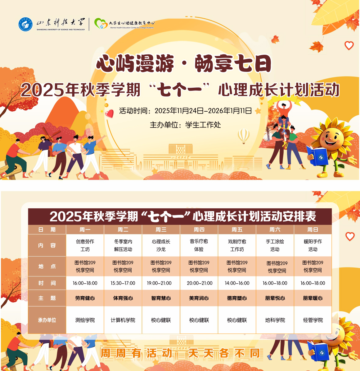 为促进大学生心理健康发展、提升积极心理素养,决定开展2025年季学期“七个一”心理成长计划系列活动,针对大学生七项心理成长主题,推出749场“菜单式团体活动”,以成长式体验持续赋能大学生成长成才。现将有关事宜通知如下: