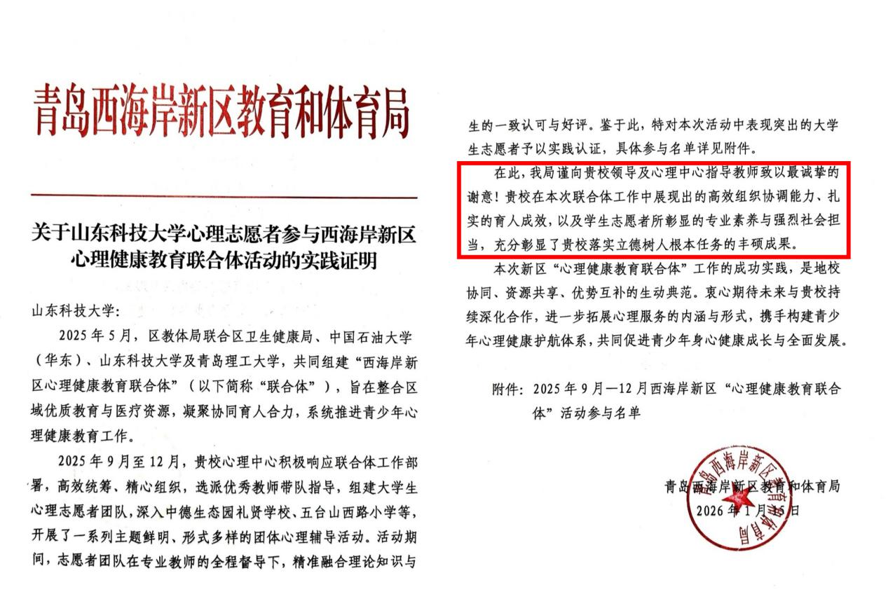 近日,青岛市西海岸新区教育和体育局办公室向我校发来公函,向学校领导及学生处大学生心理健康教育中心的指导老师致以最诚挚的谢意,来函中表示:学校在本次联合体工作中展现出的高效组织协调能力、扎实的育人成效,以及学生志愿者所彰显的专业素养与强烈社会担当,充分彰显了学校立德树人根本任务的丰硕成果。