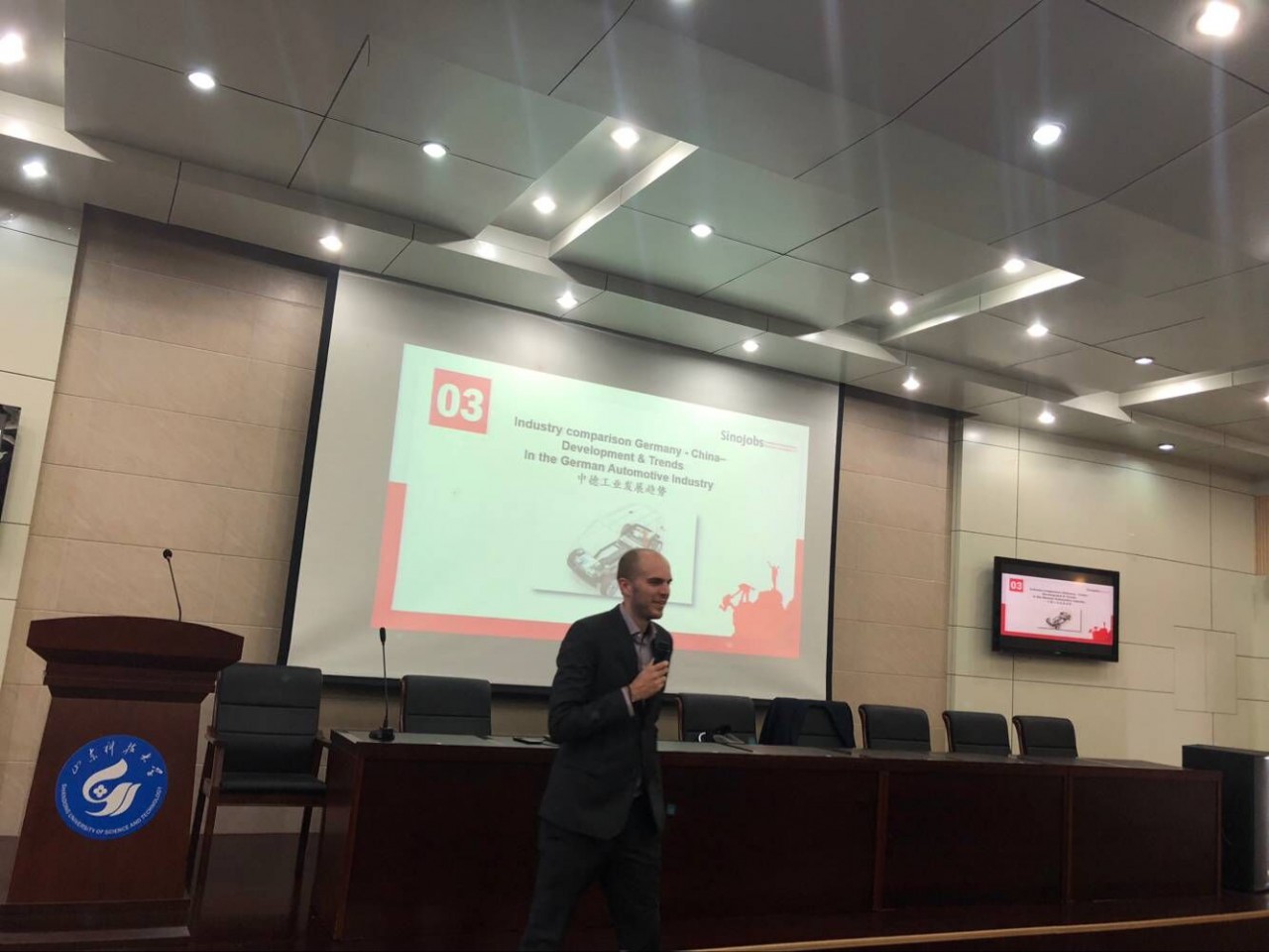 SinoJobs(职德)是面向华人的线上加线下招聘门户,拥有超过 10 万注册用户,服务企业(基本上为德国企业或欧洲企业)超过 1700 家,为大众、戴姆勒、西门子、博世、吉利汽车等知名企业引进了万余名各类人才。讲座从人才国际化发展为切入点,指出作为应聘者,需要尽快提高自己的硬技能(专业知识)和软技能(外语、沟通能力、职场适应力),以符合现代雇主对应聘者提出的要求。同时,讲座结合学校办学特色,从中德工业发展现状、流动性趋势等角度分析了现代欧洲企业对应聘者的要求。