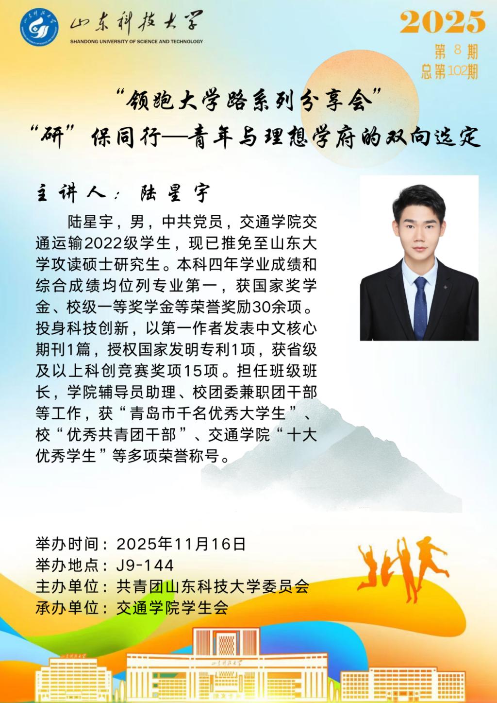 11月16日,领跑大学路第102期经验分享会在J9-144举办,本次分享会由交通学院陆星宇同学主讲,主要为同学们详细解读了学习成绩、发展素质与学术专长等问题,梳理了保研等从前期准备到系统填报的全流程要点。在互动环节,他耐心解答同学疑惑,鼓励同学立足自身兴趣与能力,保持节奏,稳步前行。